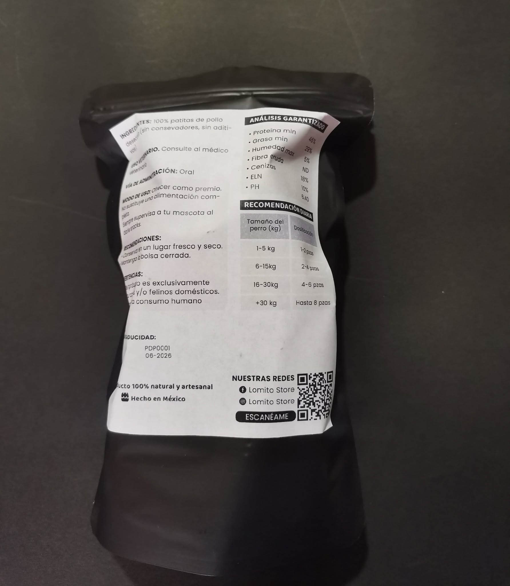 Consiente a tu lomito con un premio 100% natural, crujiente y delicioso.Nuestras patitas de pollo deshidratadas están elaboradas de forma artesanal, sin conservadores, sin colorantes y sin ingredientes artificiales. Son el snack perfecto para premiar, entrenar o simplemente demostrarle amor a tu mejor amigo.